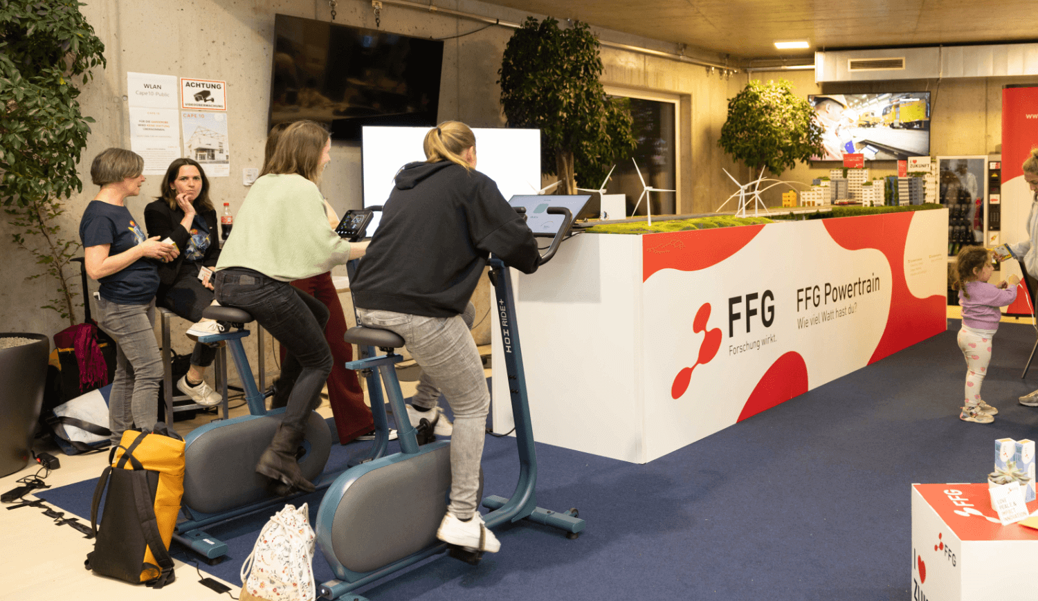 Spielerisch vermittelt der FFG Powertrain, dass die "Arbeit" am Rad Strom erzeugt und den Zug antreibt. Die Rennstrecke führt entlang einzelner Forschungsschwerpunkte,vorbei an einer Windkraftanlage hinein in die klimaneutrale Stadt und symbolisiert so den Weg in die Zukunft. Durch die Kraft der Teilnehmerinnen und Teilnehmer kommen wir dort schneller an.